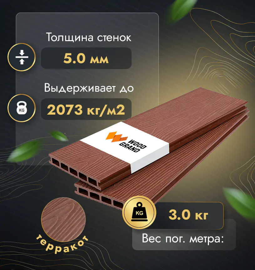 Наша террасная доска из МПК выдерживает до 3318 кг/м2, влагостойкая, не требует ухода.